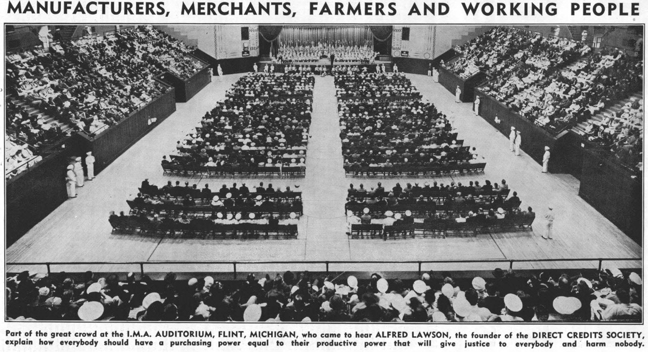 There is no sense at all to such a crazy proceeding, but the people permit the perpetration of this gigantic fraud because they have been miseducated into such foolishness in schools, colleges, newspapers, magazines, screen and over the radio by touts of the financiers who get a rake-off for the part they take in it. The working people growl, the manufacturer growls, the merchant growls and the farmer growls at each other and none of them know what they are growling about. Now, people, you are nearing the end of the road and it won’t be long before you will come face to face with the DICTATOR. You are told that it will be PROSPERITY that you will meet when you get there but I am telling you that it will be the DICTATOR. I am preparing you for the ordeal. There is going to be a terrible shock when you arrive at that corner. It is the FINANCIERS’ PLAN to give the people the shock. But it is the LAWSON PLAN to give the financiers the shock. So if you wealth producers will just follow the advice of your own coach instead of following the advice of the financiers’ touts, then, just as soon as you arrive at that historical corner and see the Dictator standing there glaring at you. instead of you taking HIS orders and all starting to fight each other as you have been in the habit of doing heretofore, you, the working people, the manufacturer, the merchant, the farmer, the inventor. the politician, the police, the soldier and the sailor, will follow MY instructions, and, uniting as one body will rush forward at full speed, and, with the roar of infuriated elephants, sweep the infernal puppet Dictator right off his feet and carry him forward until you reach the Atlantic Ocean. where you will dump him in and start him adrift for Europe, the asylum for all murderous DICTATORS.